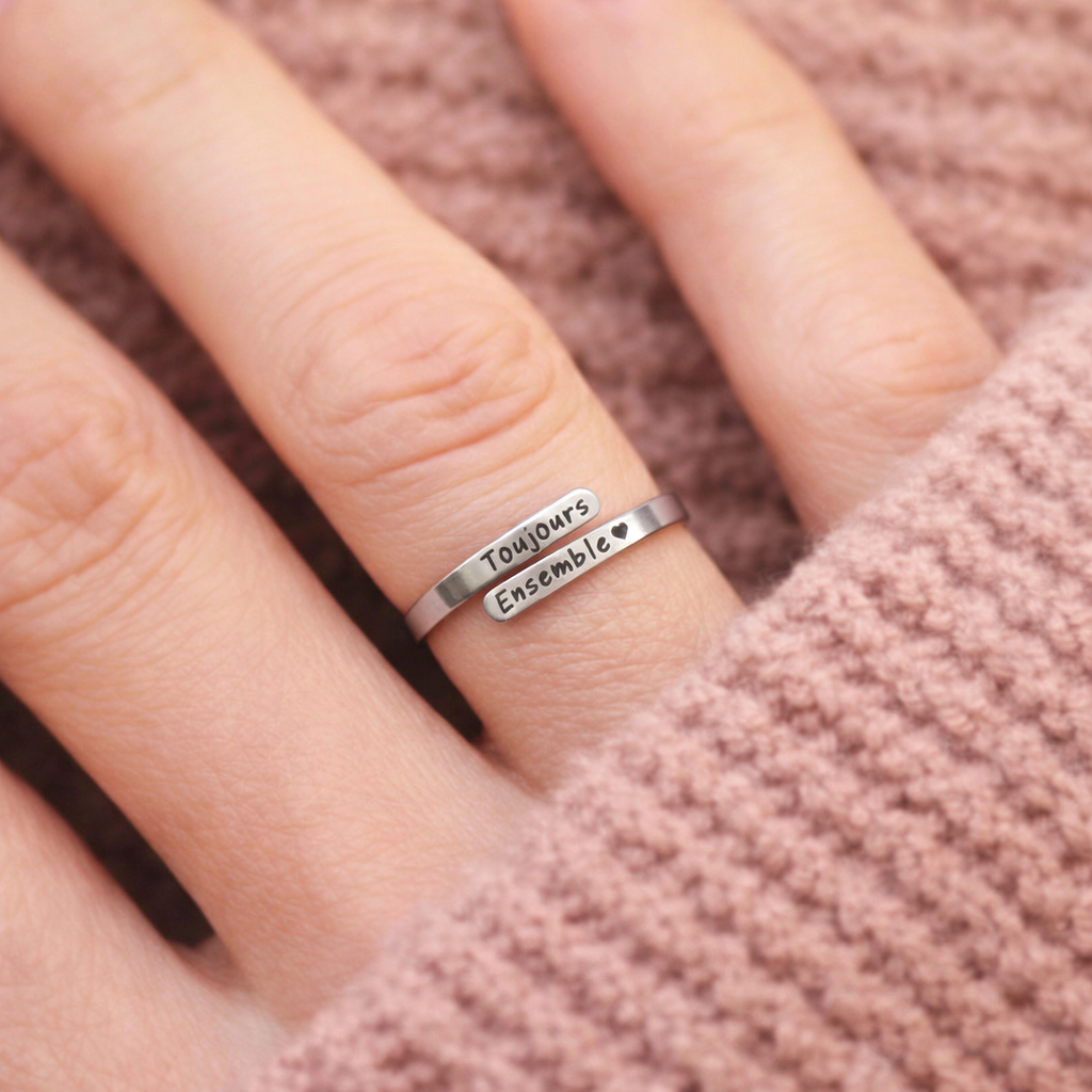 Cette bague gravée "Toujours Ensemble" est un rappel tangible de ce lien invisible qui vous unit. Une étreinte sous forme de bijou pour sentir près de vous ceux que vous aimez, quelle que soit la distance.
